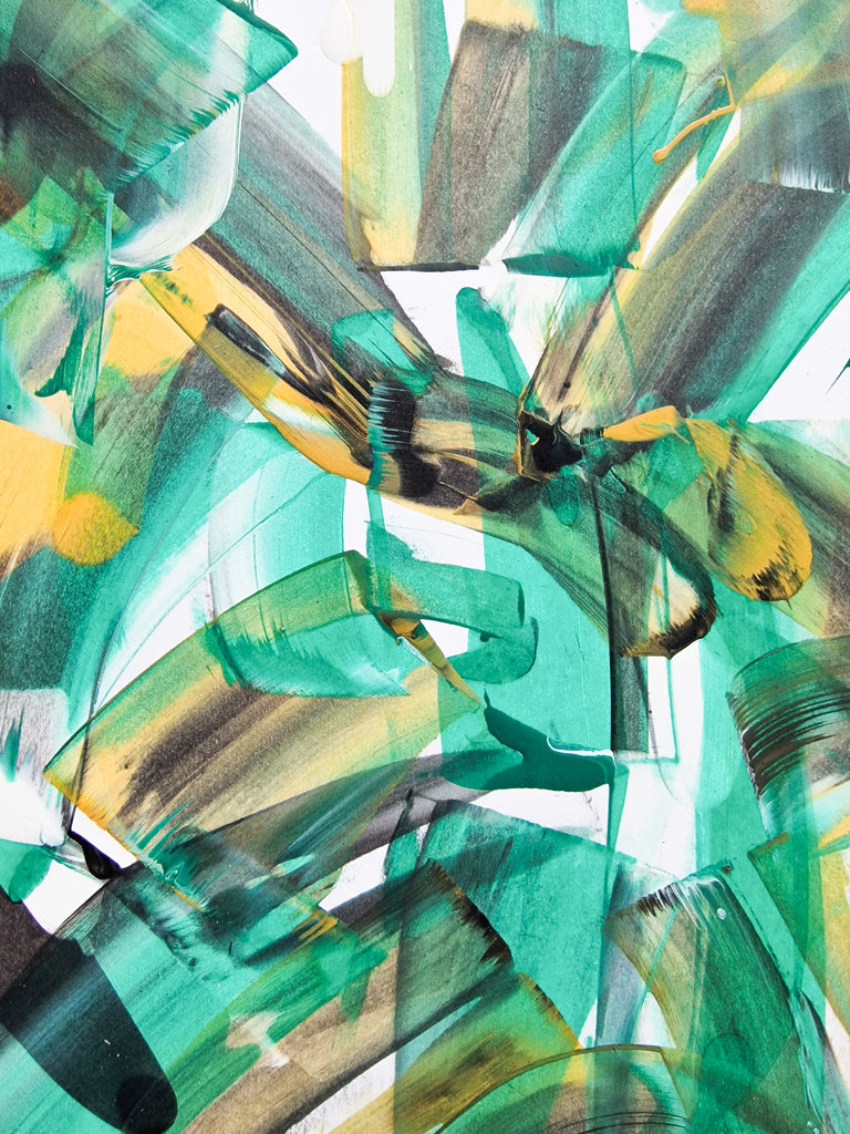 Die Gesamtform wirkt organisch und dynamisch – fast wie ein Ausbruch ineinander verschlungener Formen oder ein Gewirr sich verschiebender Bänder. Trotz des fließenden Pinselstrichs harmonieren die Farben wunderbar, wobei die Gelbtöne den kühleren Grüntönen und dunkleren Akzenten Wärme und Leuchtkraft verleihen.