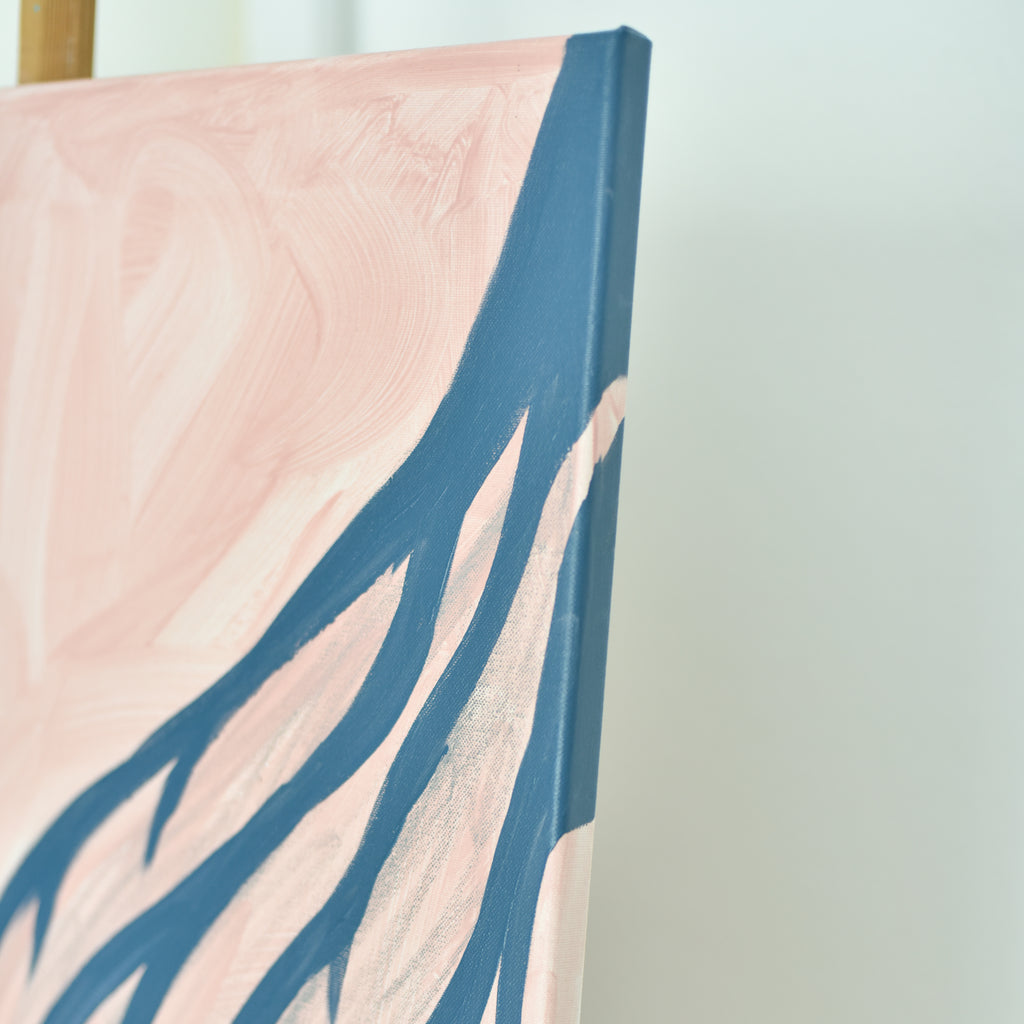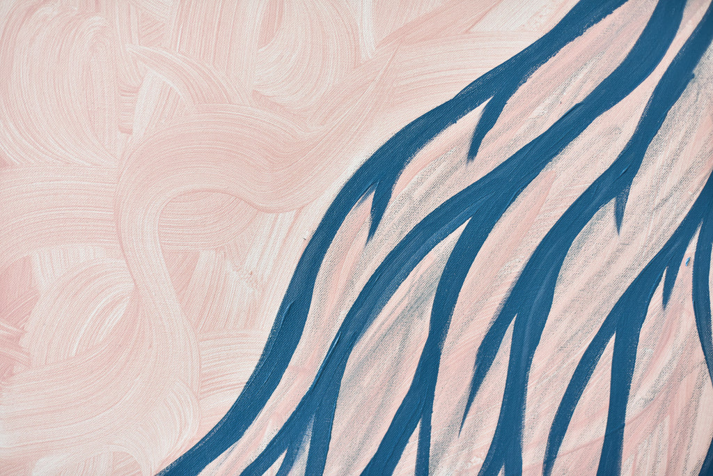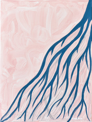 Aus der oberen rechten Ecke fließen kräftige, fließende marineblaue Linien diagonal über die Leinwand wie Ströme schmelzenden Schnees, die wie von Schwerkraft und Licht gezogen herabfließen. Diese verzweigten Formen spiegeln die Muster entstehender Flüsse, weicher werdender Schneefelder und des unter der gefrorenen Oberfläche wieder auftauchenden Lebens wider.