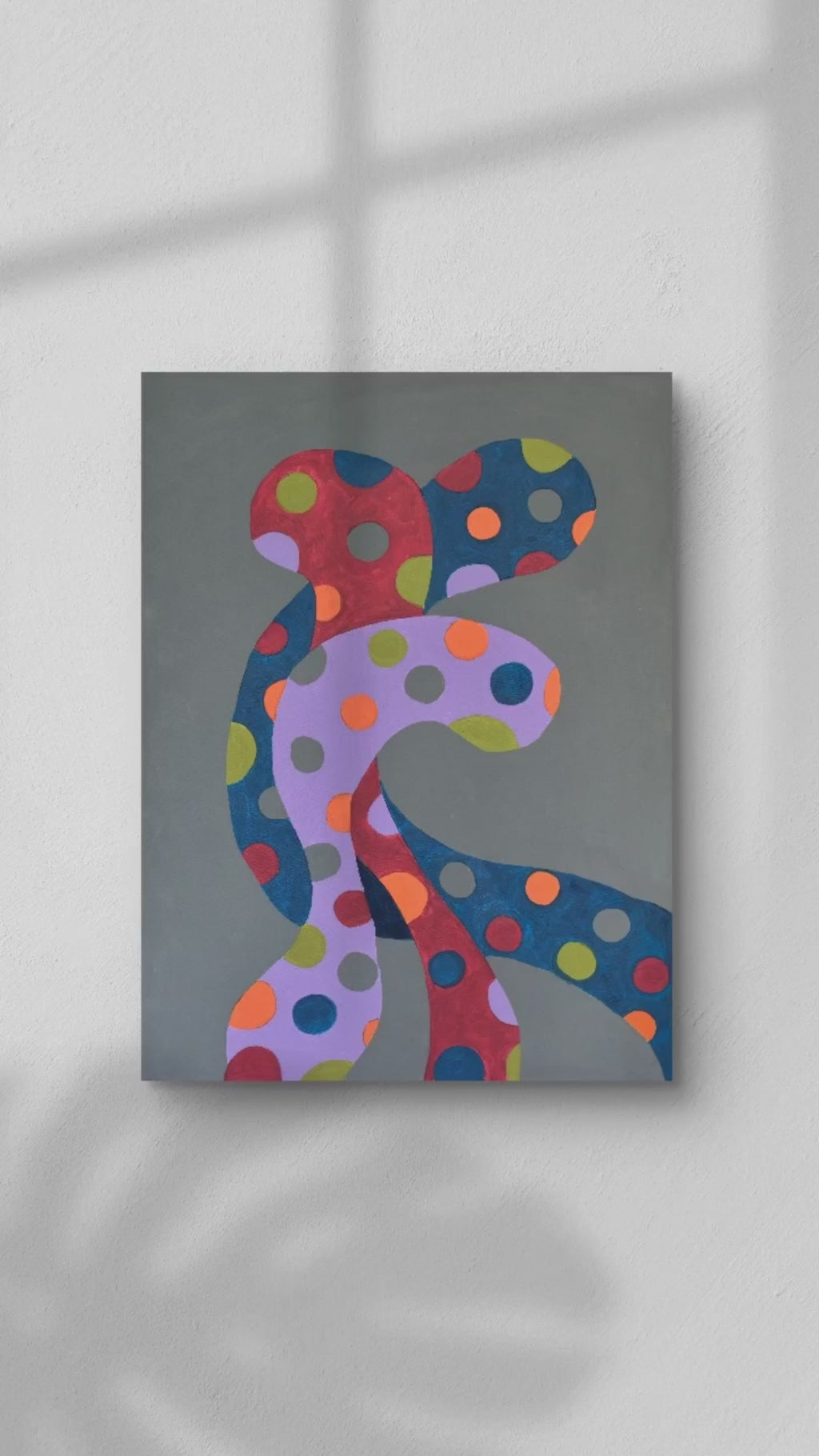 Dieses faszinierende abstrakte Kunstwerk zeigt wirbelnde Formen auf grauem Hintergrund. Die Formen, die an mysteriöse Kreaturen oder Pflanzen erinnern, sind mit violetten, roten, blauen, grünen und orangefarbenen Punkten bedeckt.